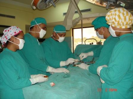 The surgeries are performed six days a week by two units. Unit I operates on Monday, Wednesday and Friday while Unit II operates on Sunday, Tuesday and Thursday. There are altogether seven orthopaedic surgeons and ten medical officers in the surgical team and 5 more orthopaedic surgeons working as volunteers. There are 3 anasthetists working to run the operating theaters along with anaesthetist assistant nurses, scrub nurses and floor nurses. The surgery is assisted by the use of two c-arm fluoroscopes and one portable x-ray machine.